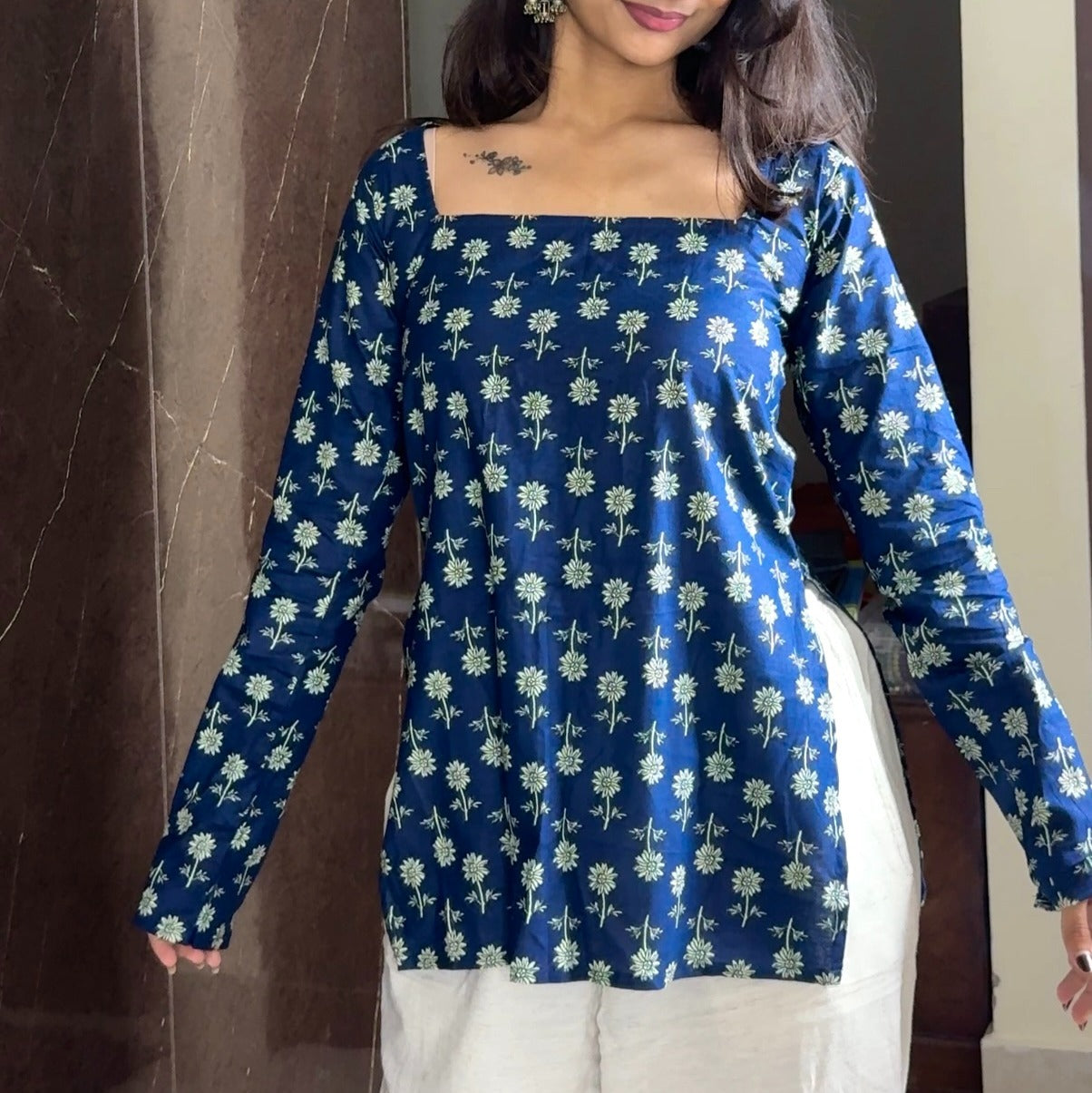 - Fabric & Print: Crafted from premium cotton featuring delicate white floral motifs on a navy blue base — a timeless print that’s both versatile and striking.