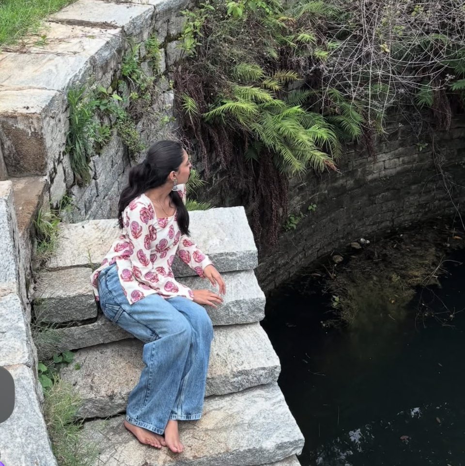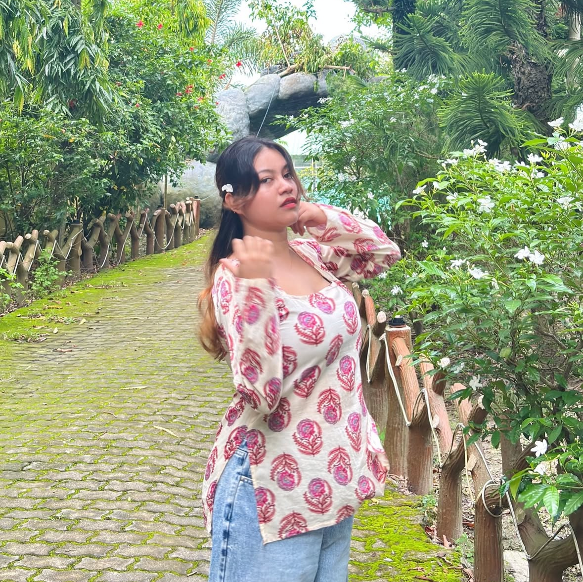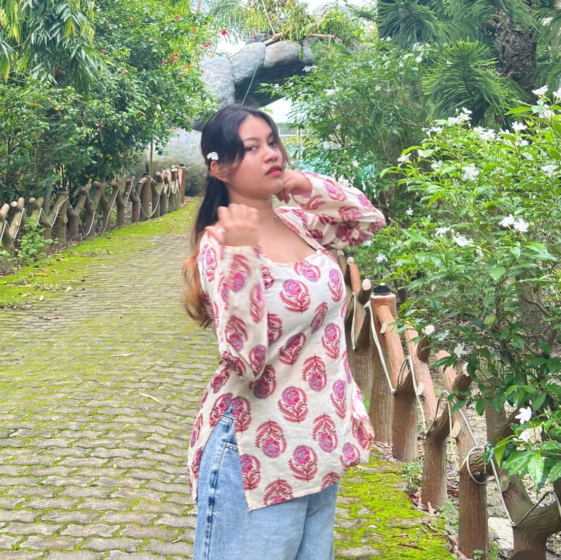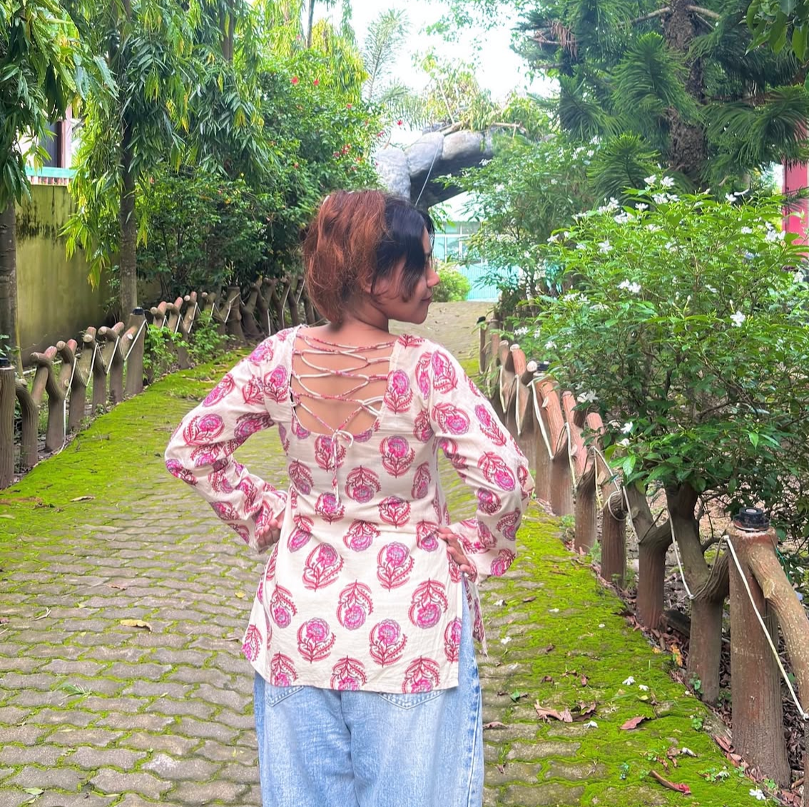 The Leela Pink is where comfort flirts with nostalgia. Hand-block printed on soft cotton in delicate hues of rose and crimson, this kurti celebrates timeless femininity. Its charm lies in the signature OG back design — a lace-up corset-inspired tie detail that beautifully frames your back and adds a touch of modern sensuality to a classic Indian silhouette.