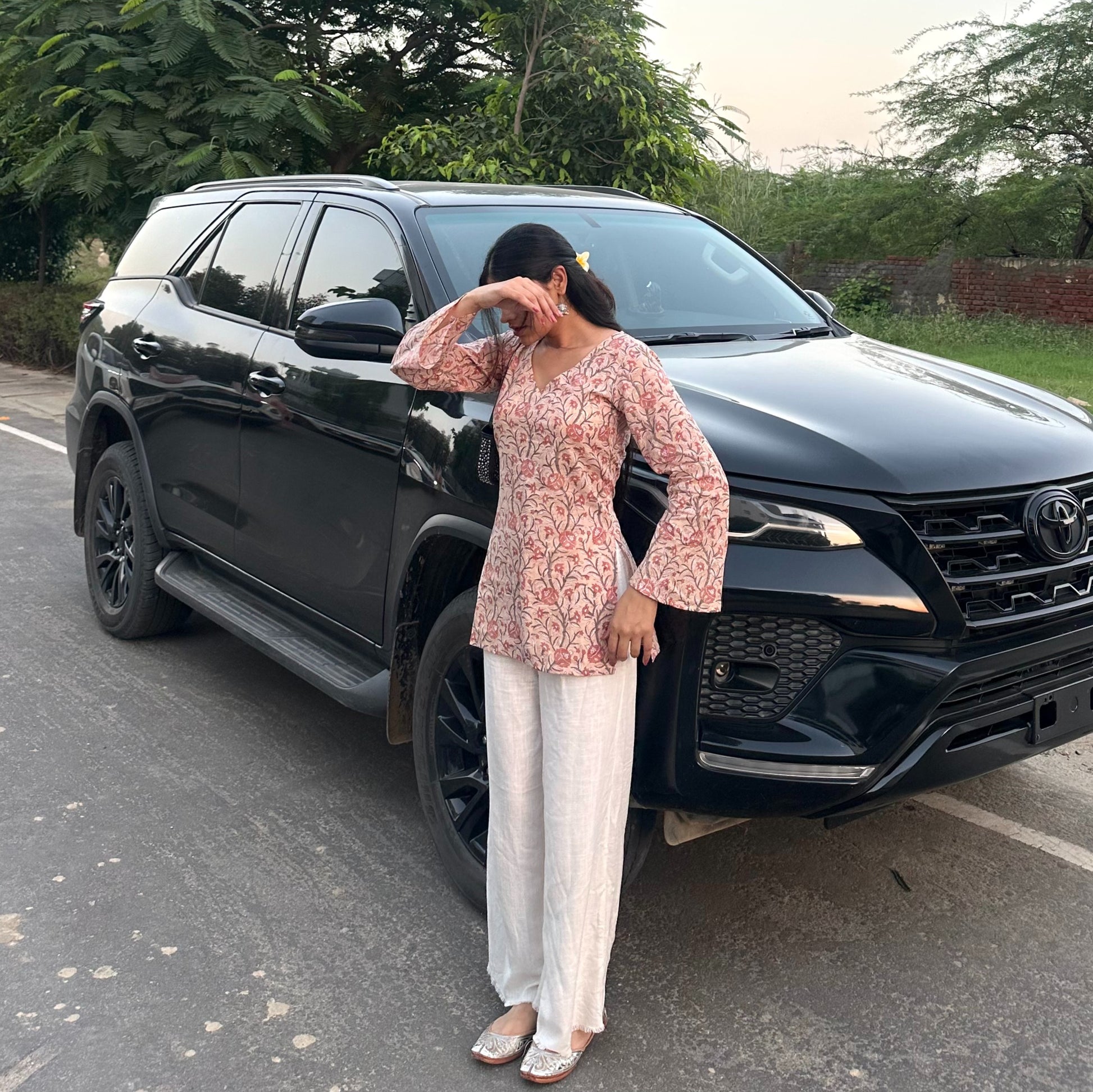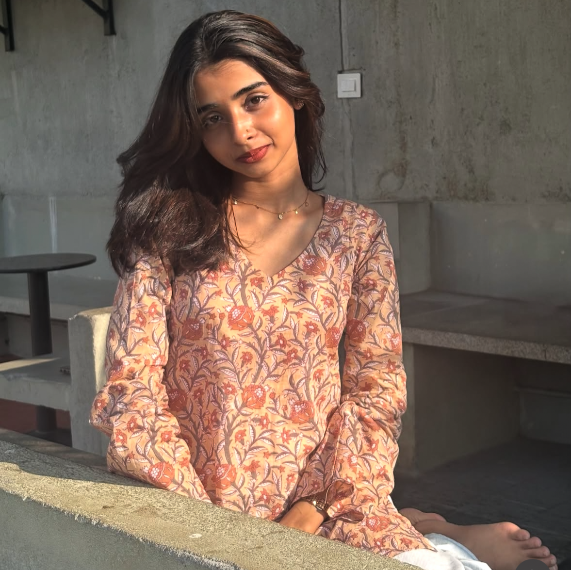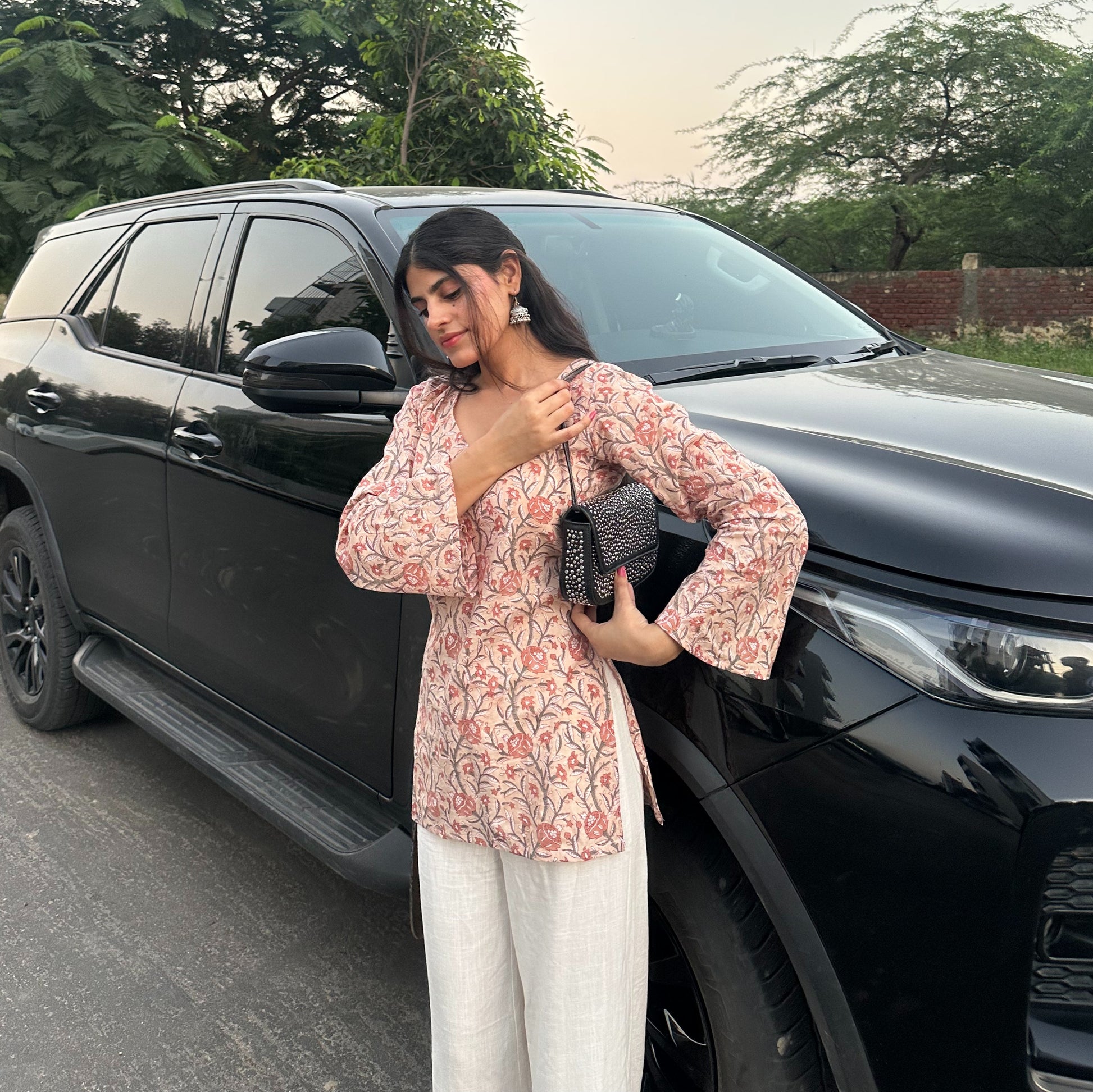 - Fabric & Print: Made from breathable cotton fabric, adorned with intricate peach and beige block-printed florals that bring warmth and softness to your look.