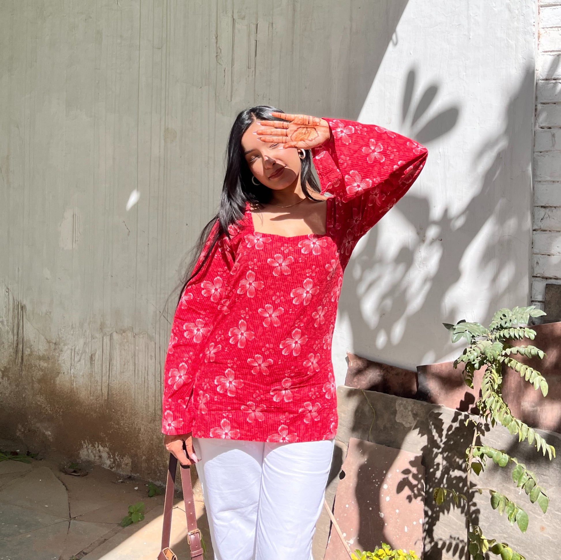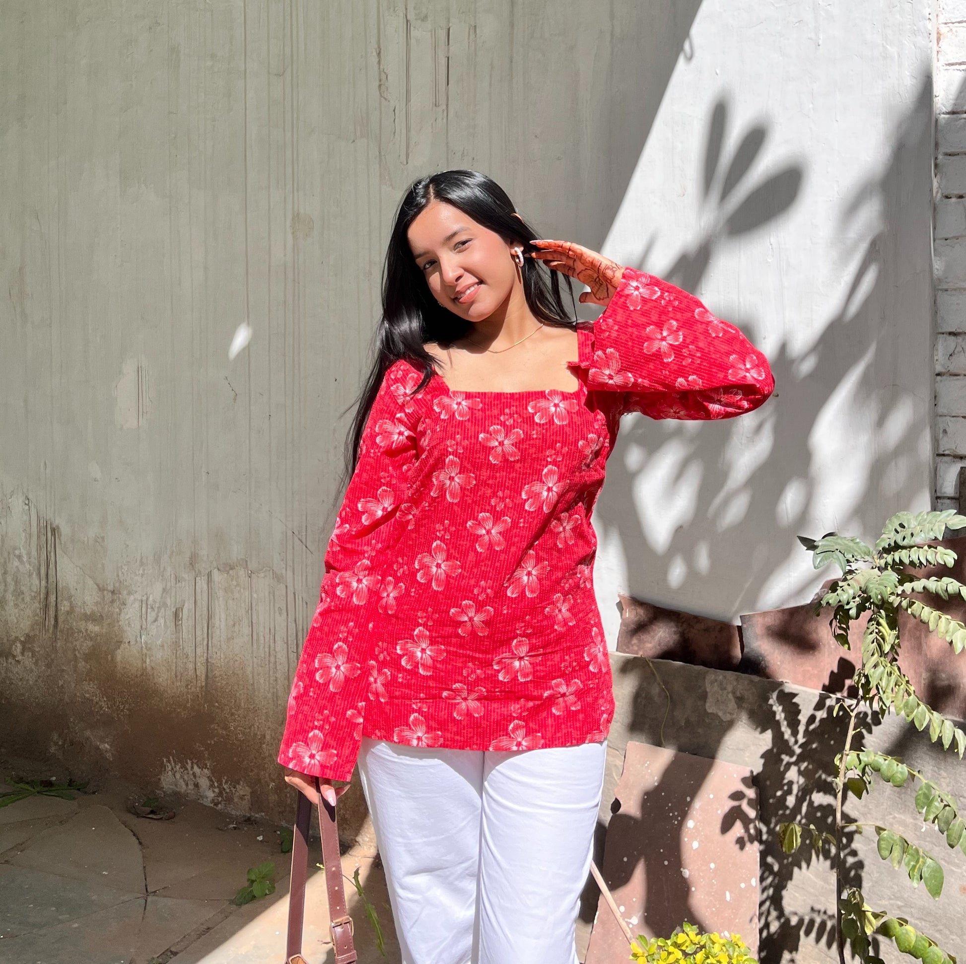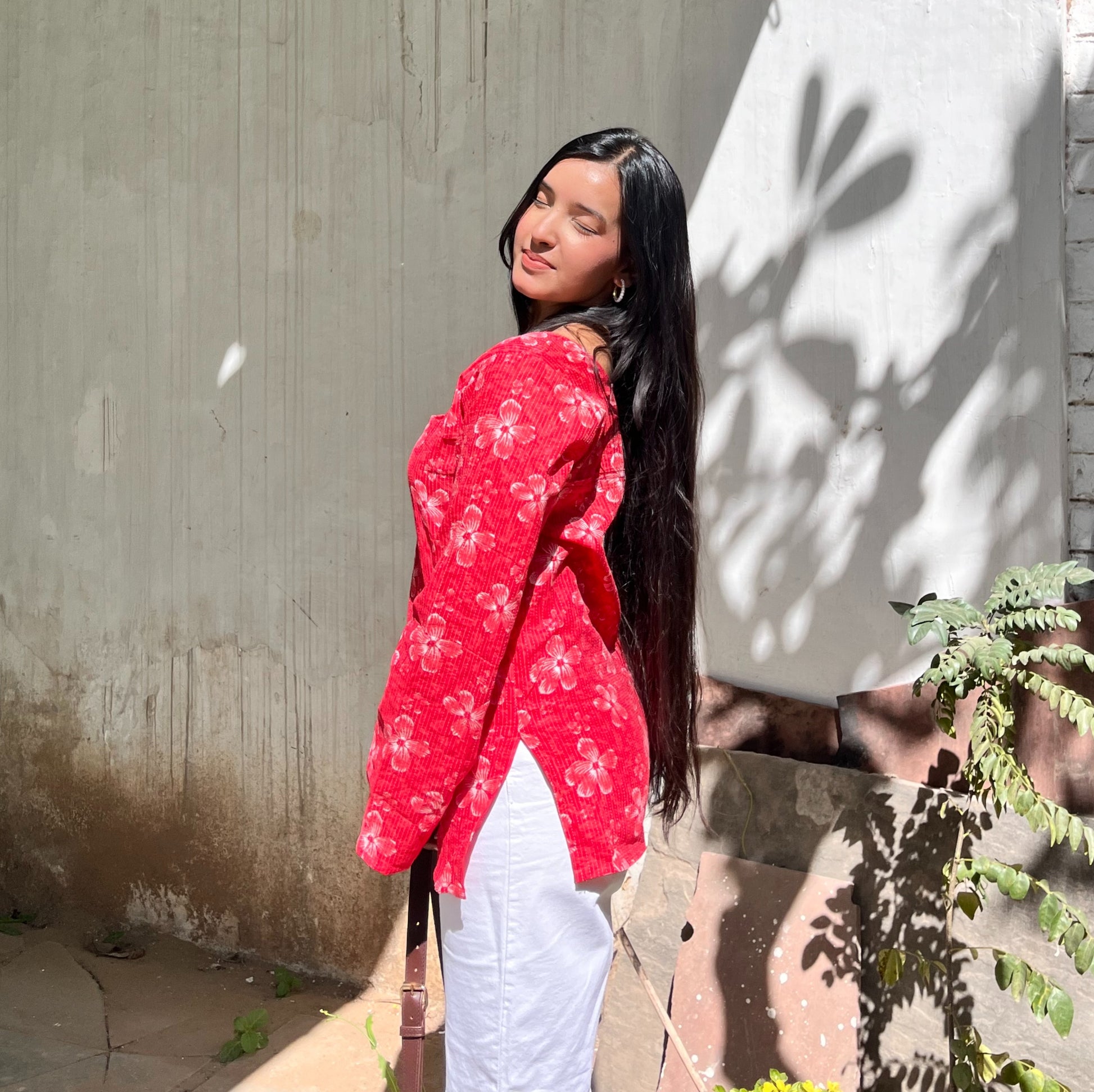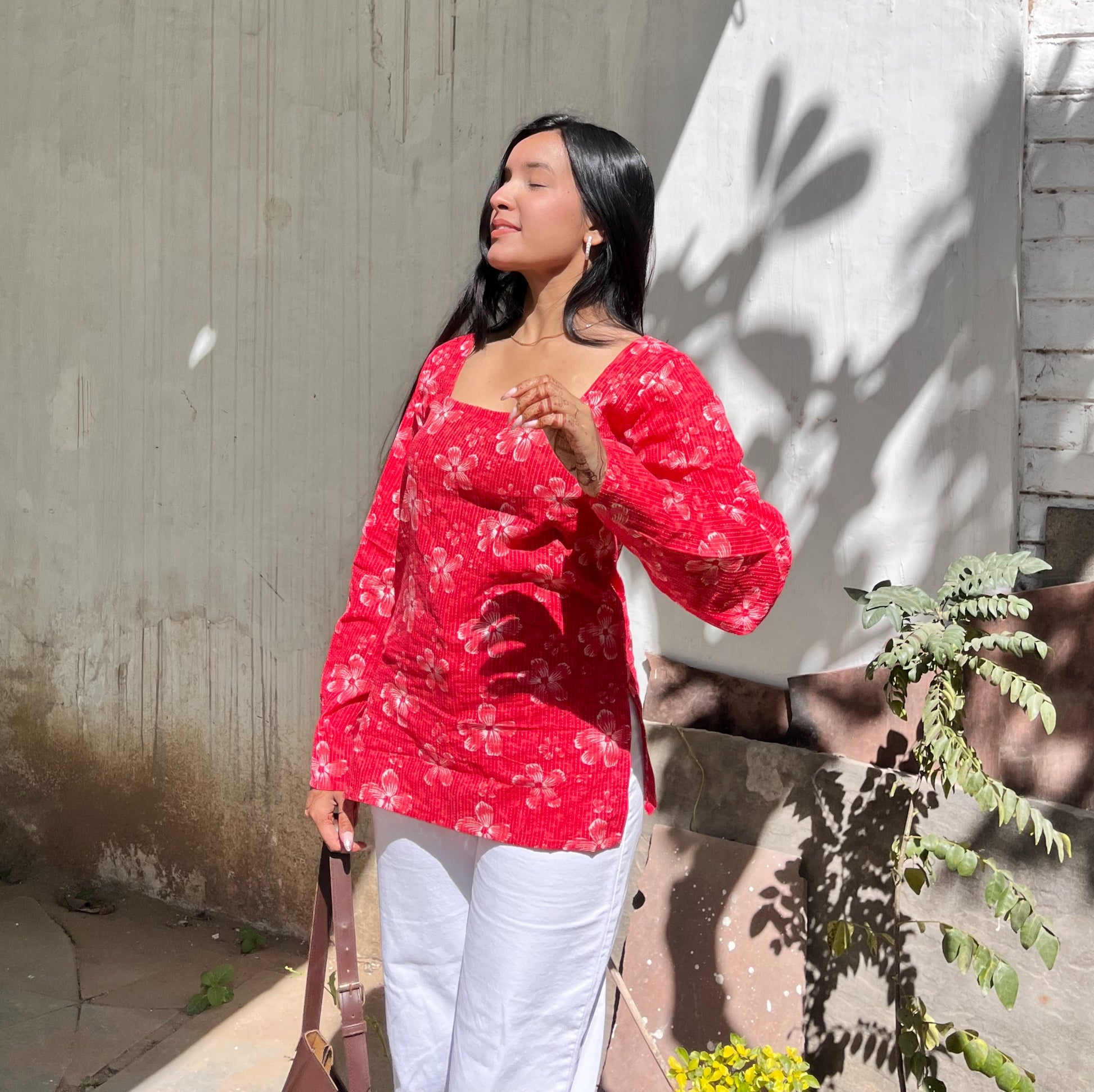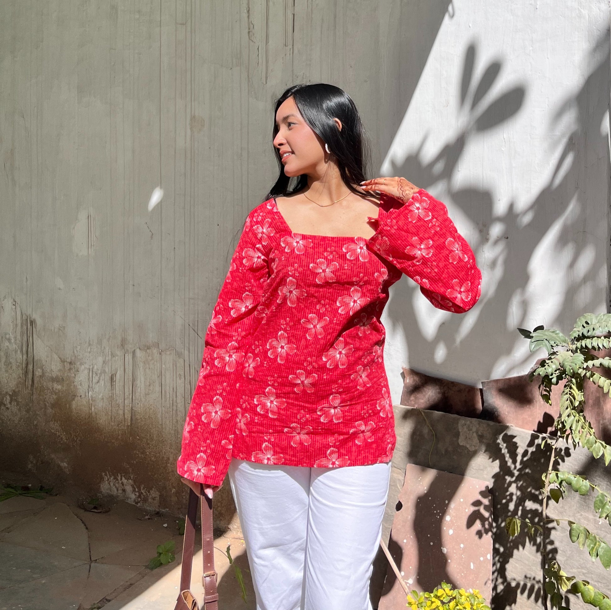 - Fabric & Print: Made in soft cotton with hand-block floral motifs on a vibrant red base. The pattern features rhythmic stripes underneath, giving depth and texture to every bloom.