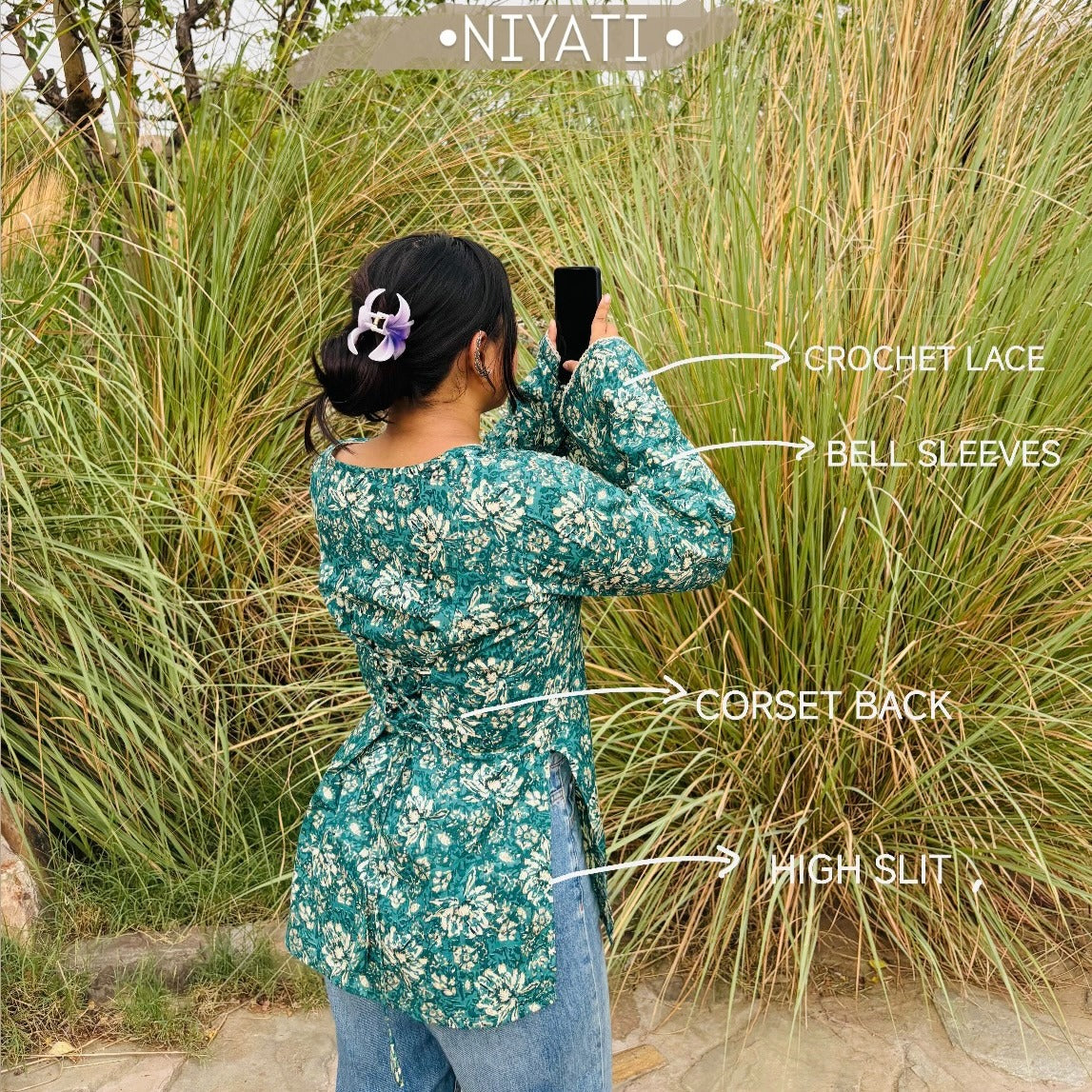 The Niyati Kurti is where elegance meets quiet confidence. Crafted in a serene shade of teal with delicate floral patterns, it’s designed for the woman who believes grace doesn’t have to shout. The highlight — a beautifully laced corset-style back — lets you adjust the fit to your liking while adding just the right hint of allure.