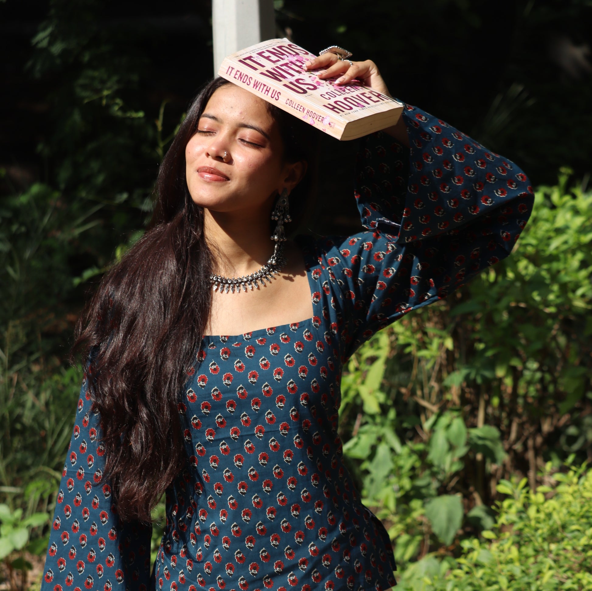 - Fabric: Made from 100% breathable cotton with handblock-inspired red and cream motifs on a rich teal base — lightweight, airy, and made for all-day wear.