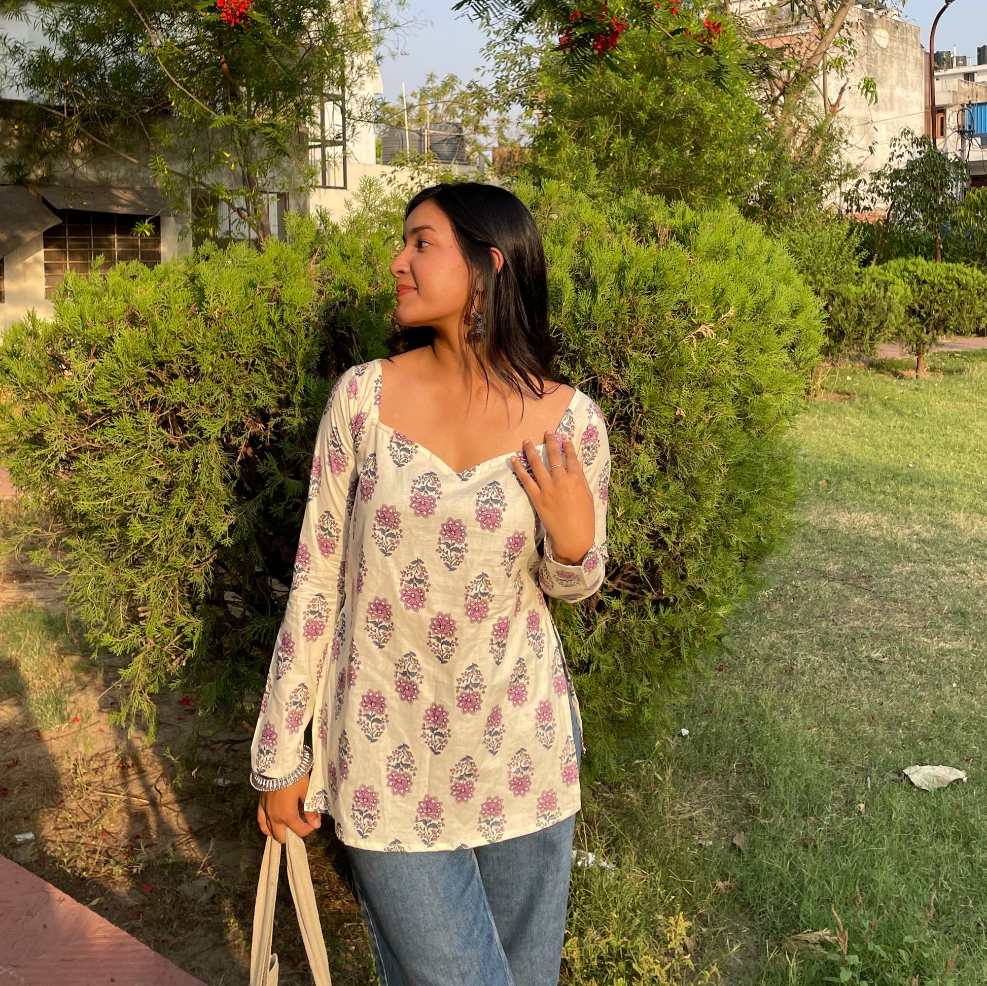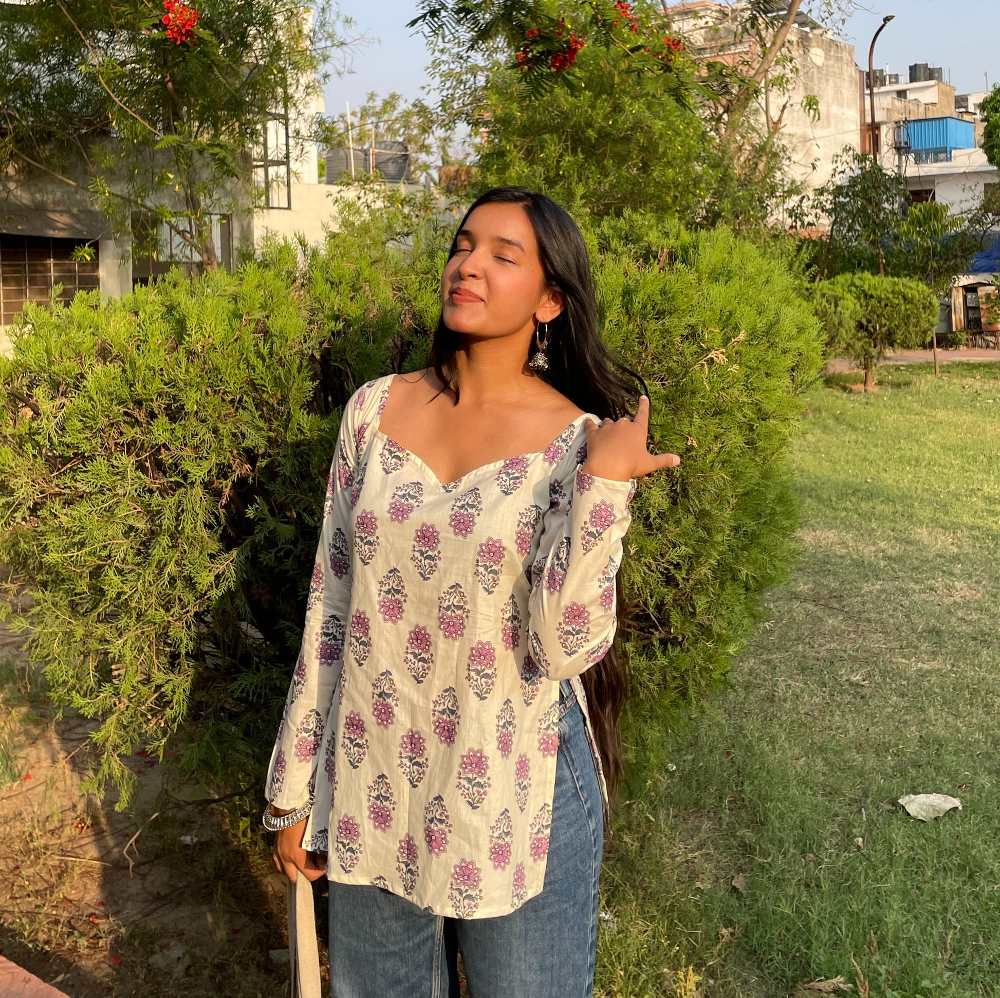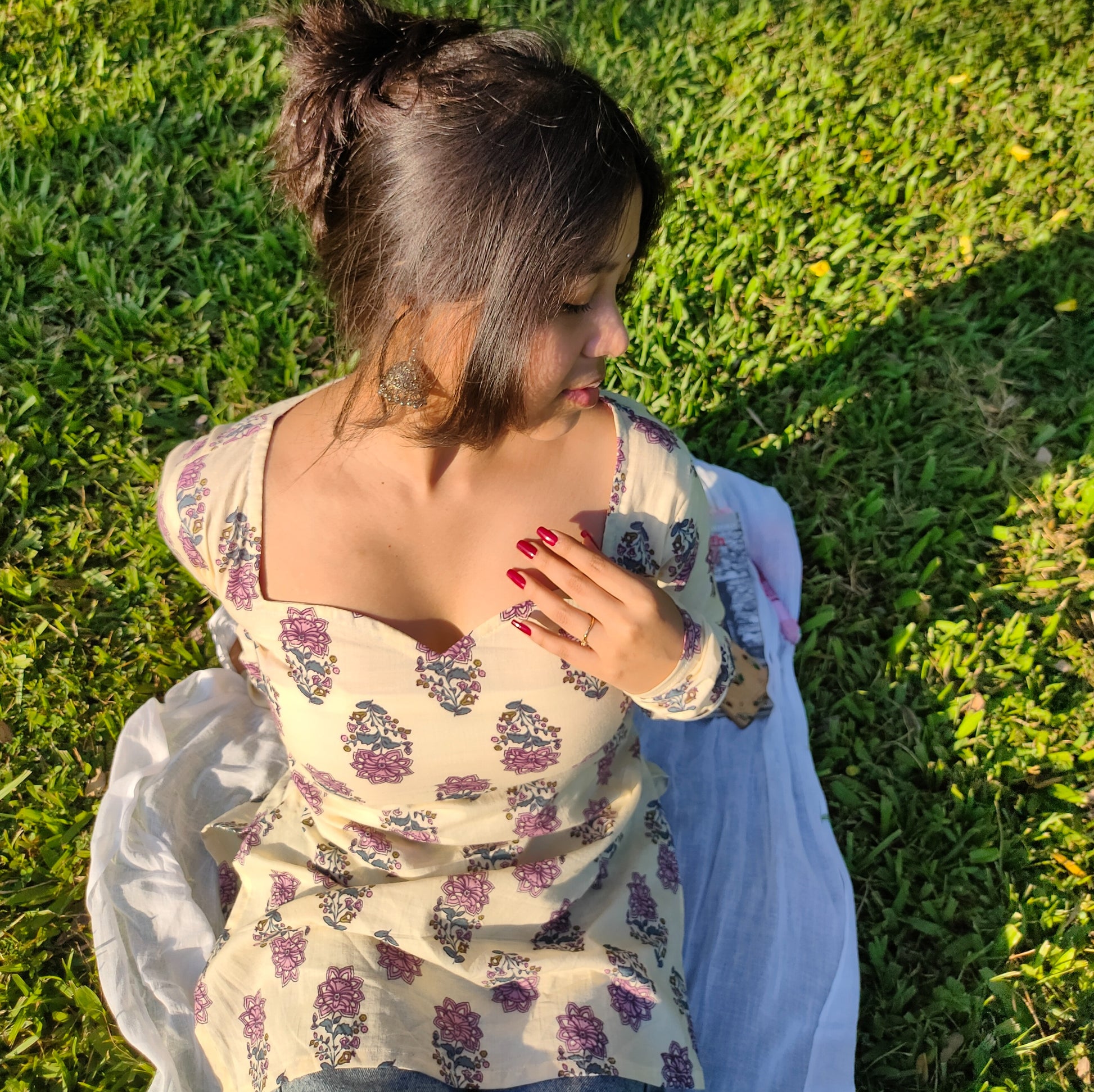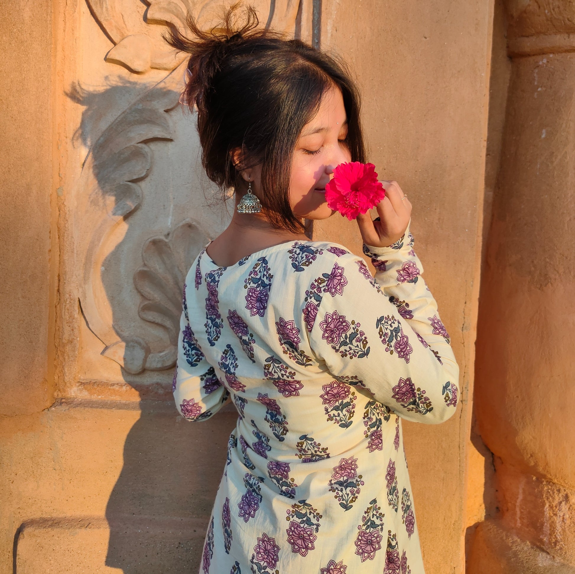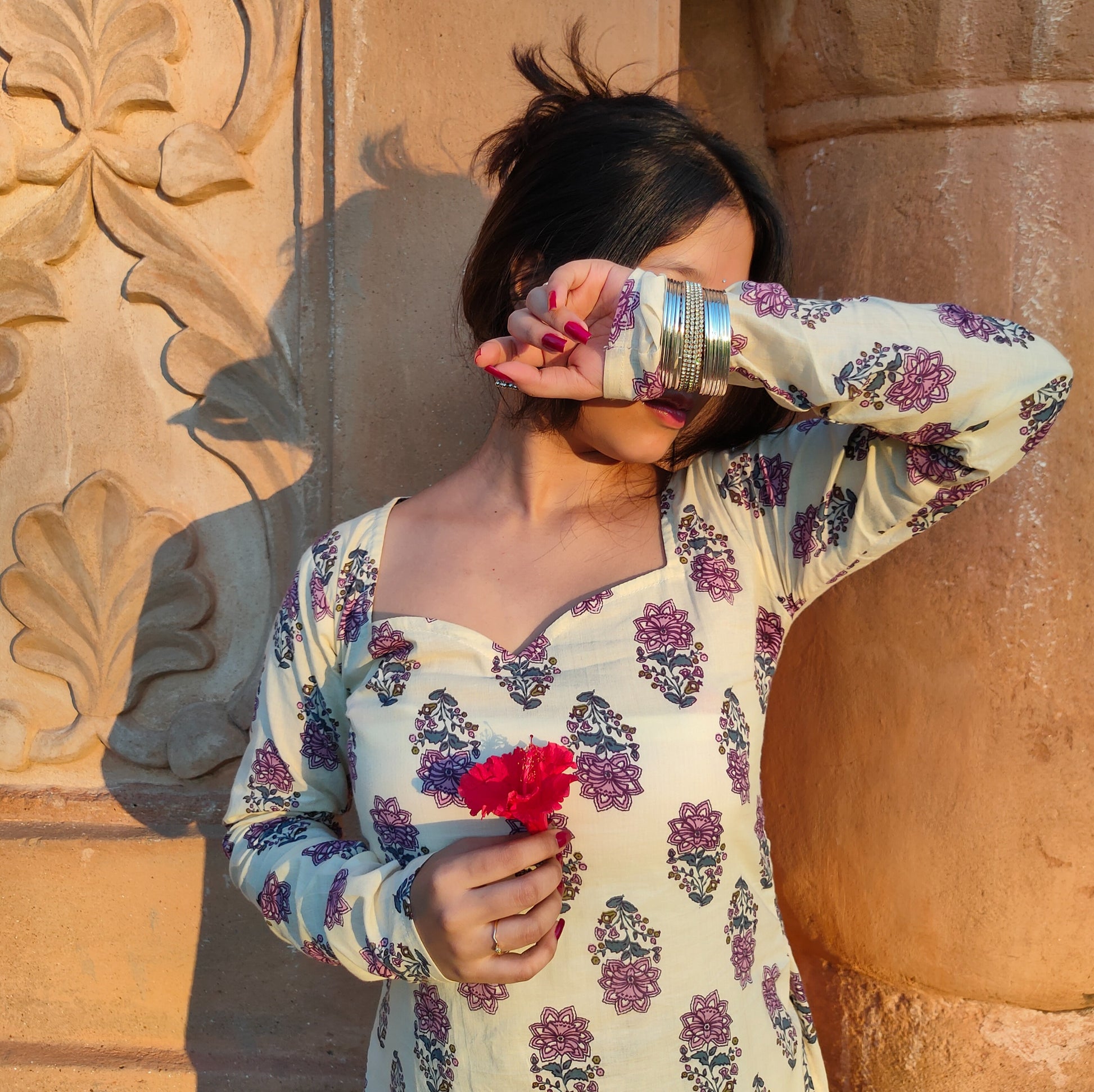 Fresh, feminine, and timeless — the Sia Kurti is crafted to highlight effortless beauty with its flattering sweetheart neckline and versatile design. The ivory base is adorned with delicate handblock-inspired floral motifs in purple and teal, making it a must-have piece that balances tradition with modernity.