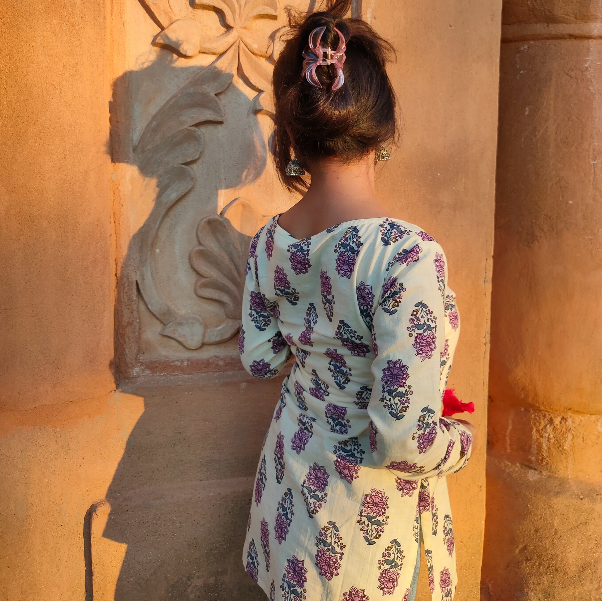 - Fabric & Print: Breathable cotton with detailed floral motifs, hand-printed for an authentic artisanal feel.
