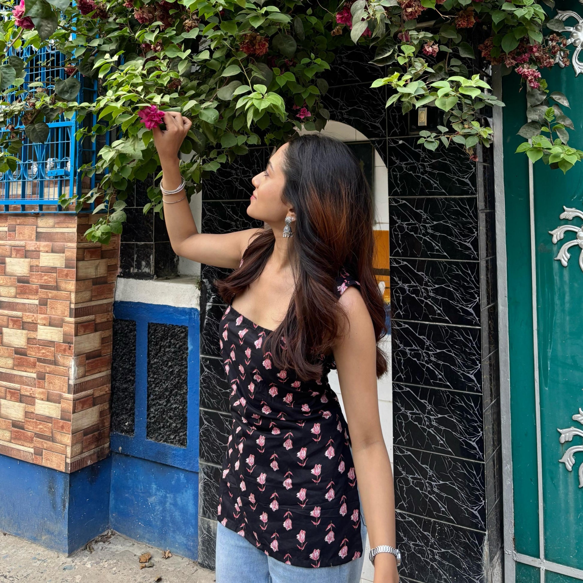 - Fabric & Print: Lightweight cotton featuring handblock-inspired tulip motifs in pink, beautifully contrasted against a deep black base.