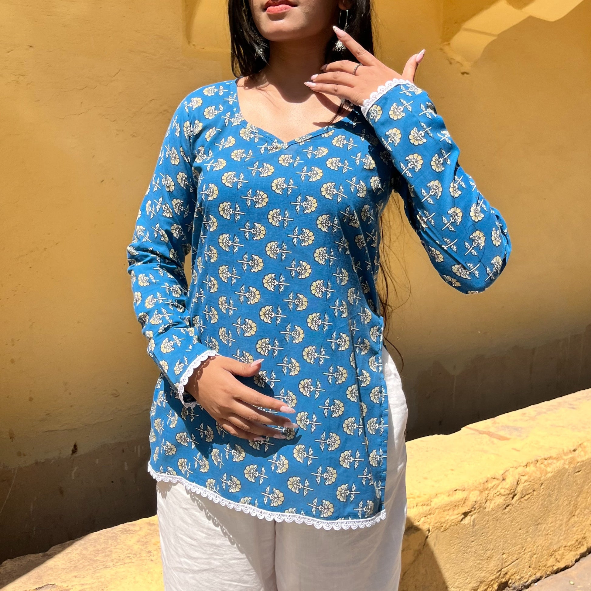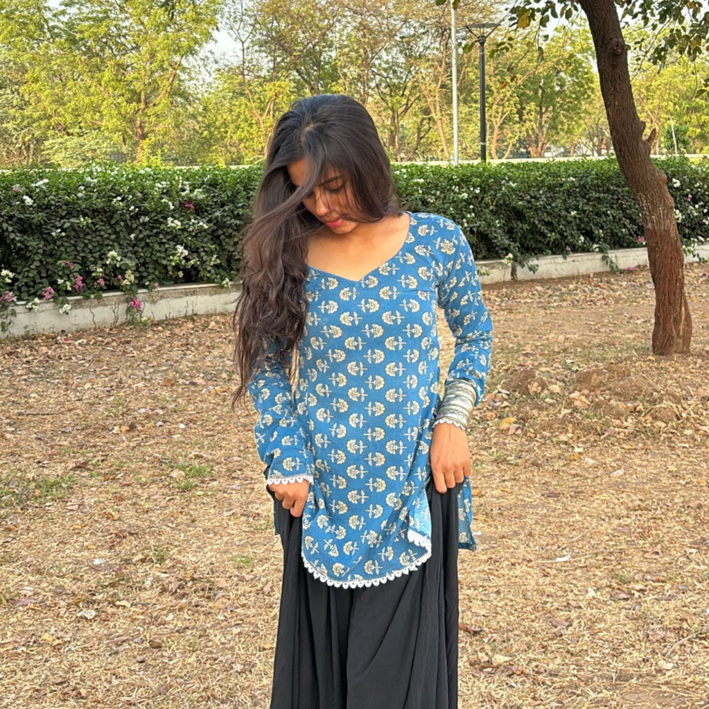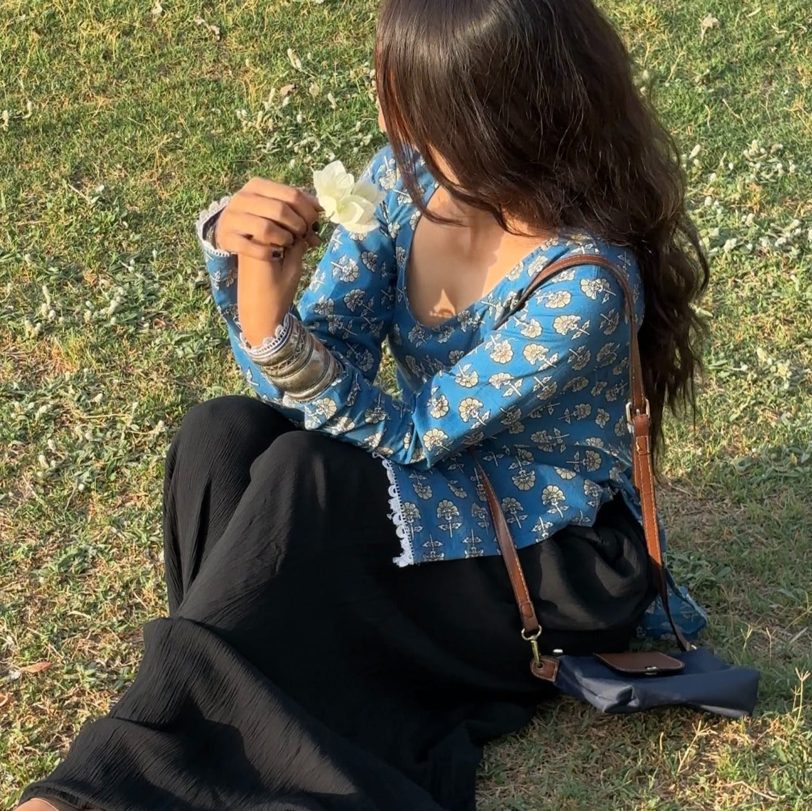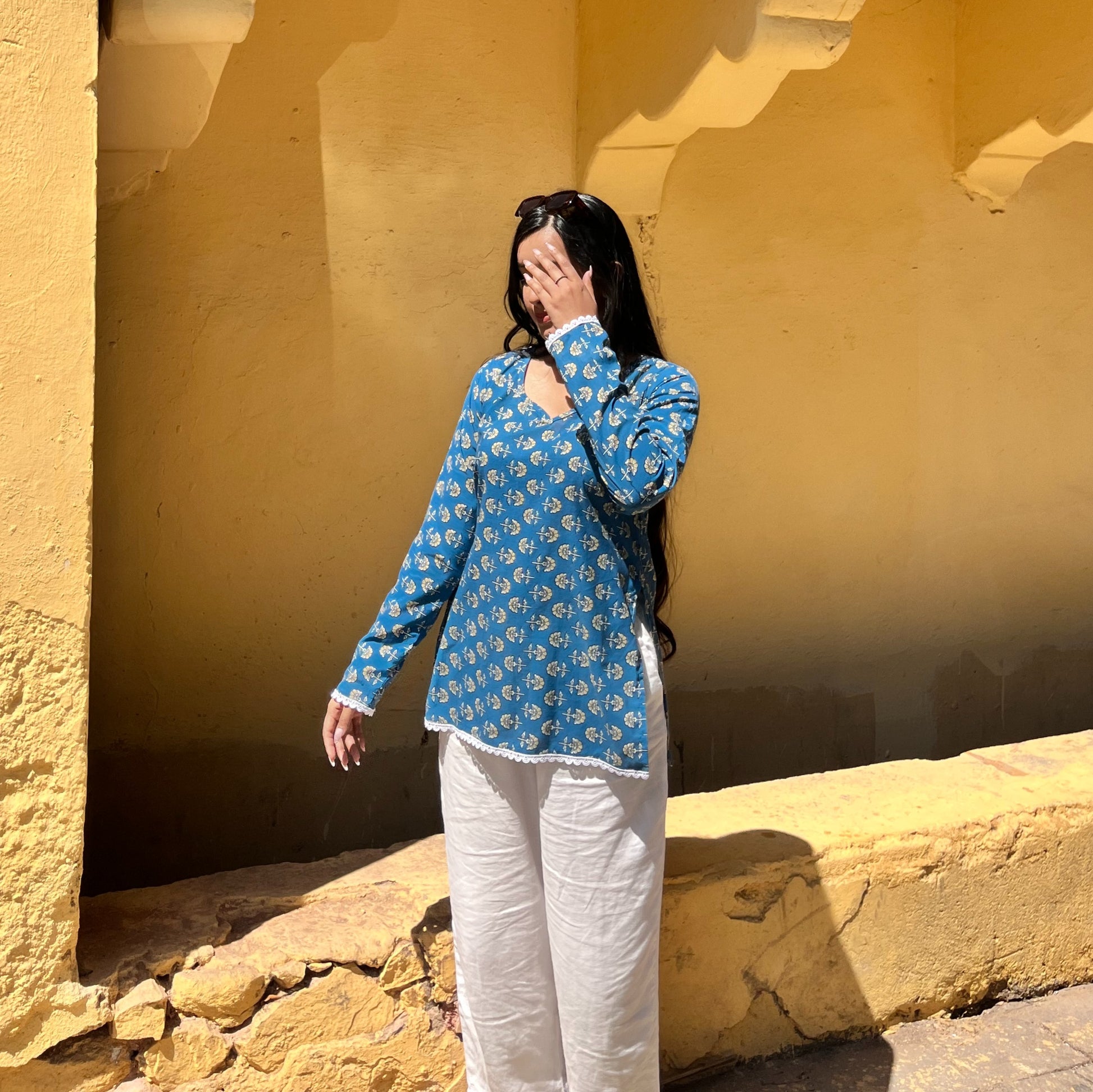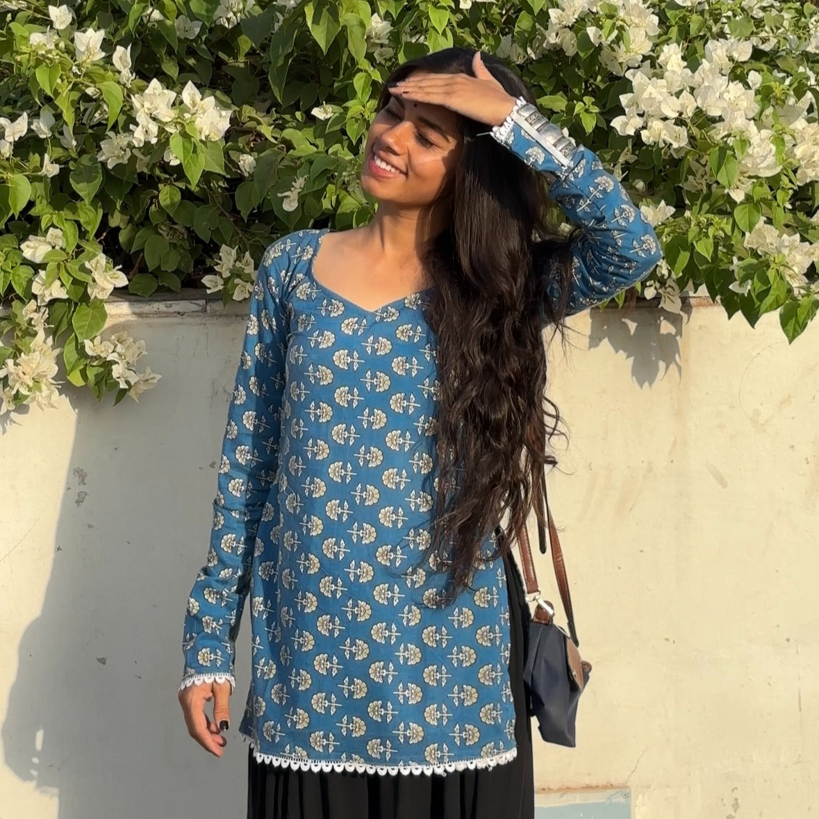 - Fabric & Print: Soft, breathable cotton in a serene blue shade, handblock-inspired floral motifs in muted tones of beige and white.